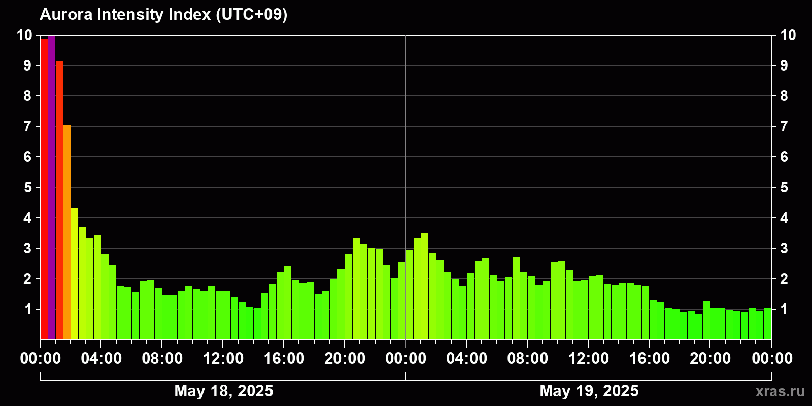 Changes in the auroral intensity index from 2025-05-18 to 2025-05-19 local time