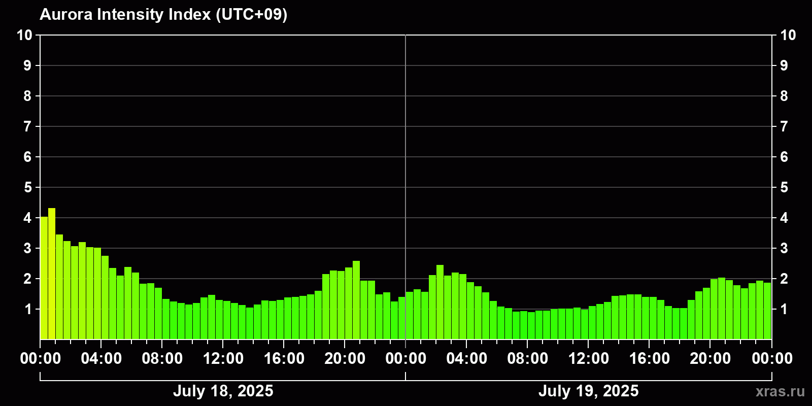 Changes in the auroral intensity index from 2025-07-18 to 2025-07-19 local time