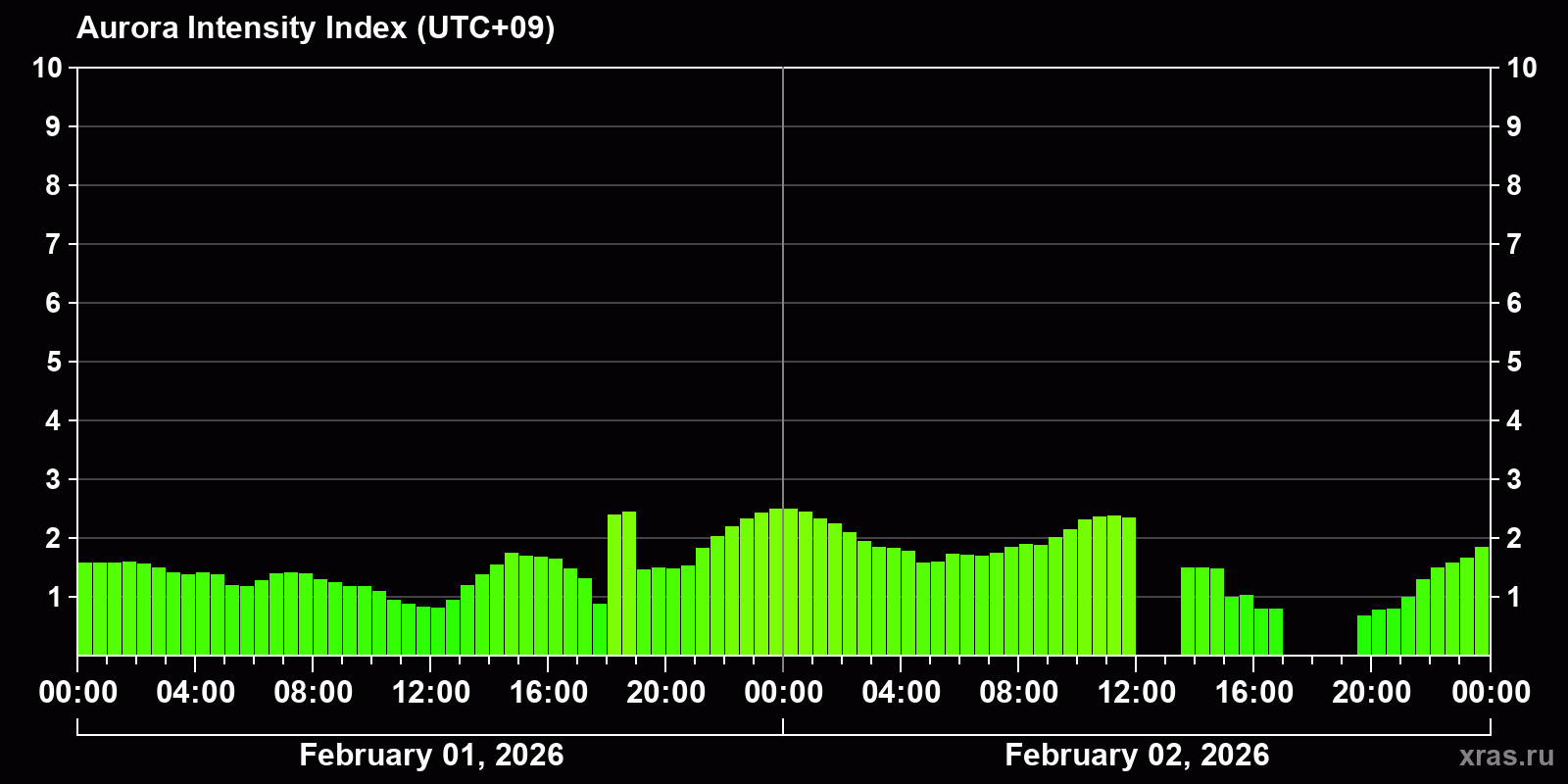 Changes in the auroral intensity index from 2026-02-01 to 2026-02-02 local time