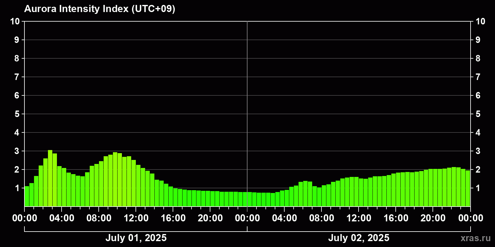 Changes in the auroral intensity index from 2025-07-01 to 2025-07-02 local time