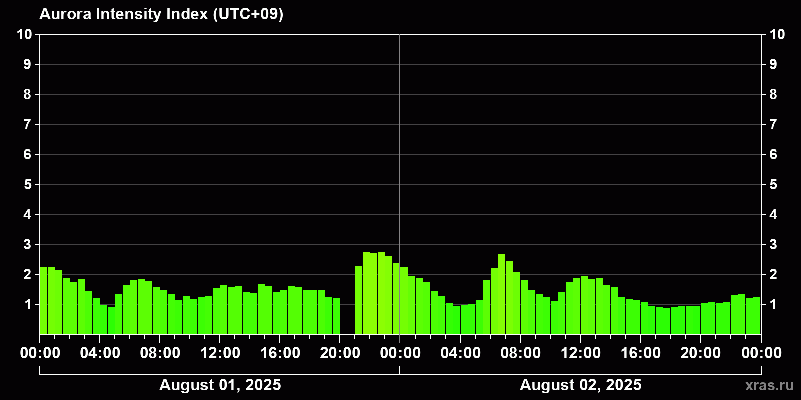 Changes in the auroral intensity index from 2025-08-01 to 2025-08-02 local time