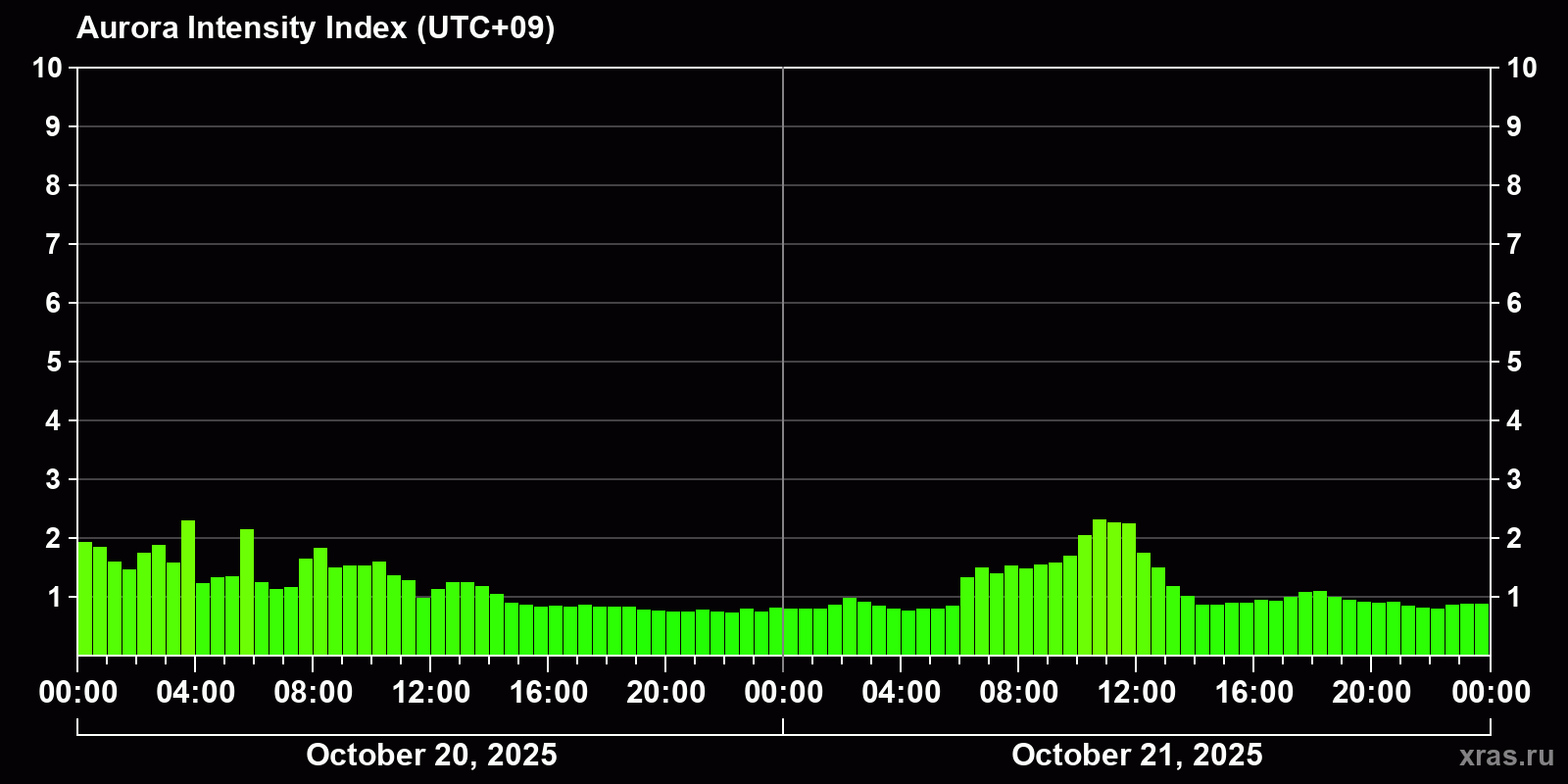 Changes in the auroral intensity index from 2025-10-20 to 2025-10-21 local time