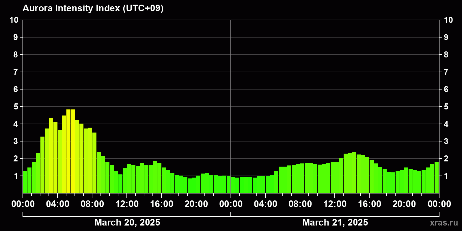 Changes in the auroral intensity index from 2025-03-20 to 2025-03-21 local time