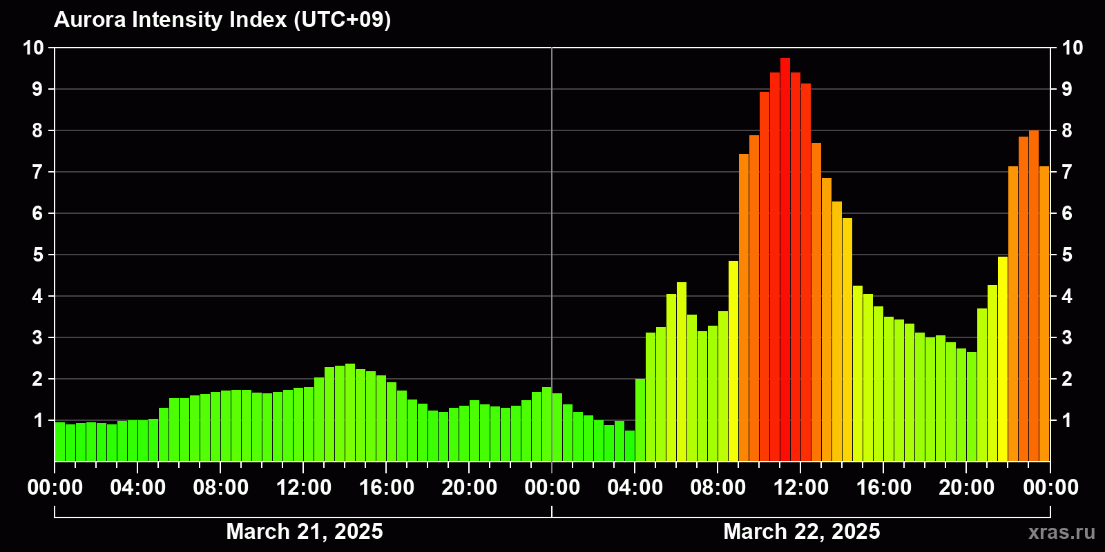 Changes in the auroral intensity index from 2025-03-21 to 2025-03-22 local time