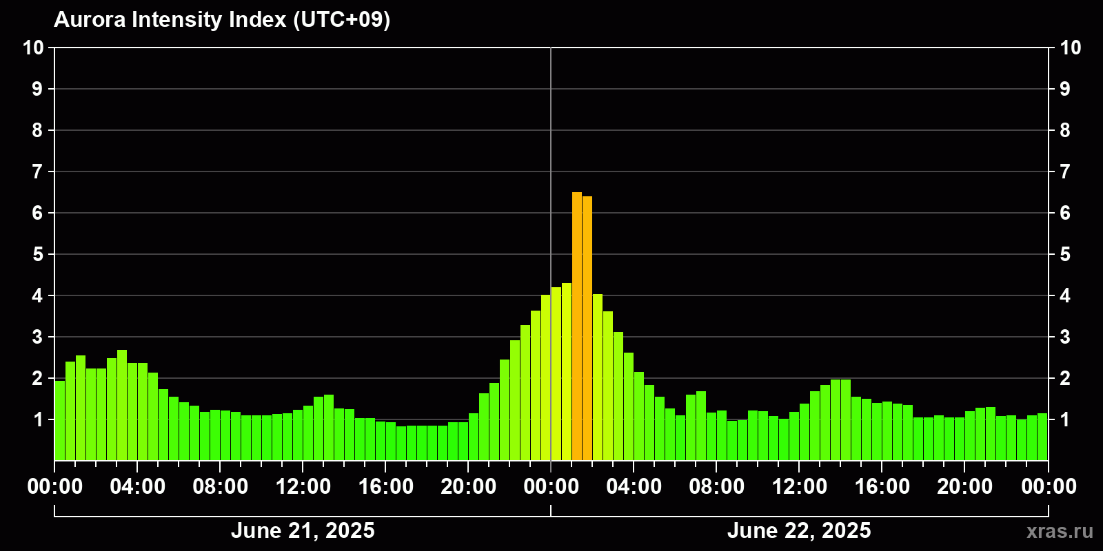 Changes in the auroral intensity index from 2025-06-21 to 2025-06-22 local time