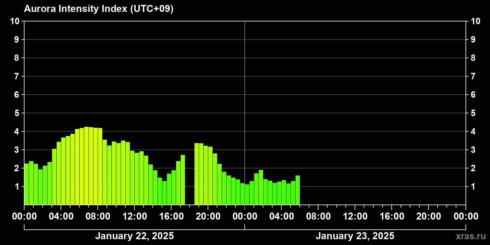 Changes in the auroral intensity index from 2025-01-22 to 2025-01-23 local time