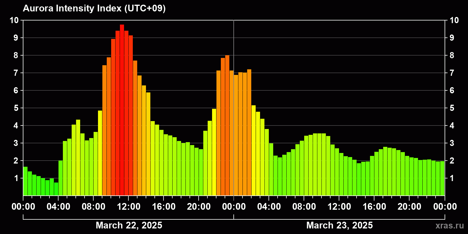 Changes in the auroral intensity index from 2025-03-22 to 2025-03-23 local time