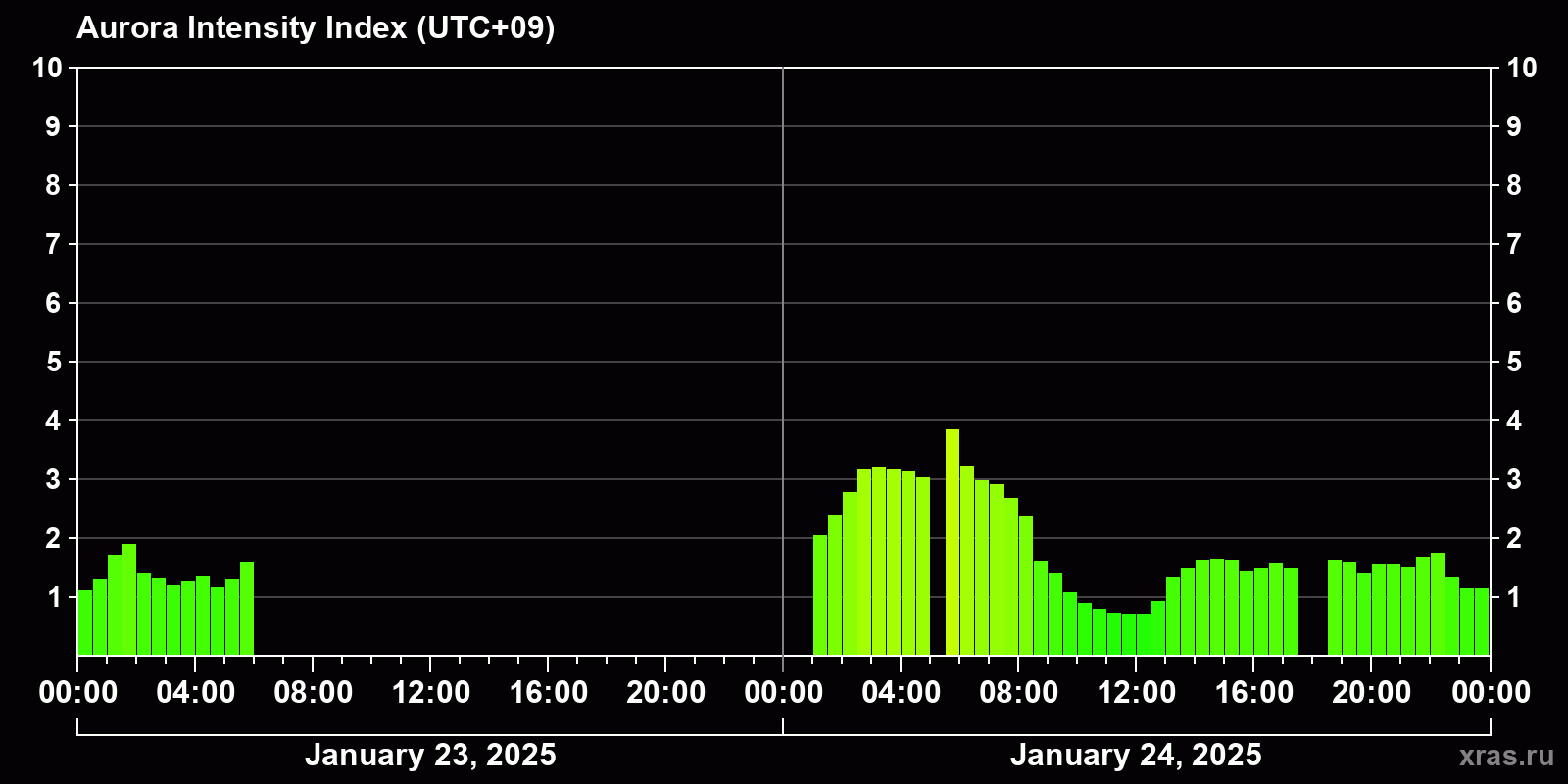 Changes in the auroral intensity index from 2025-01-23 to 2025-01-24 local time