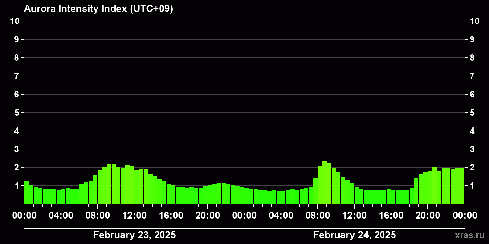 Changes in the auroral intensity index from 2025-02-23 to 2025-02-24 local time