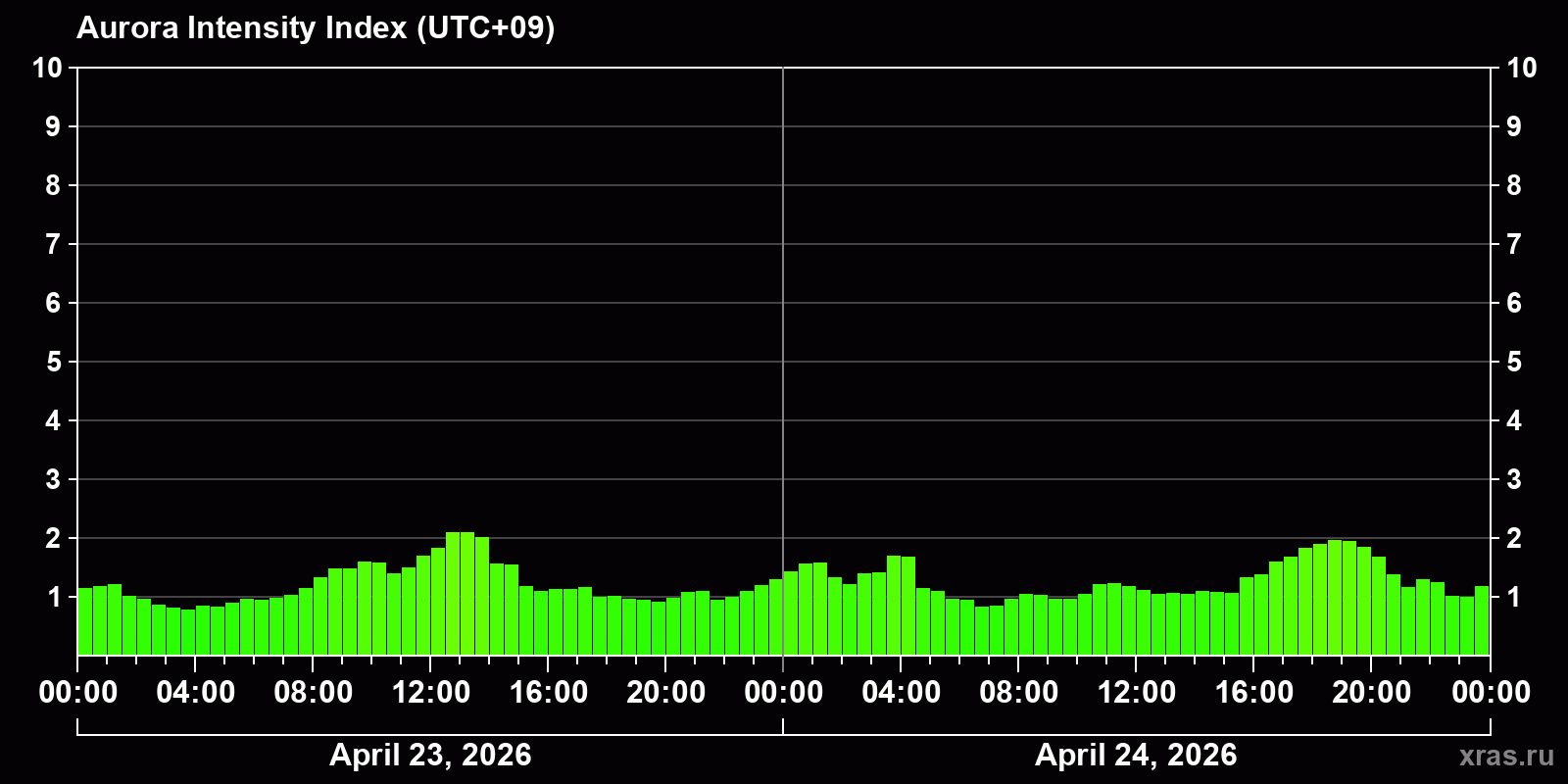 Changes in the auroral intensity index from 2026-04-23 to 2026-04-24 local time