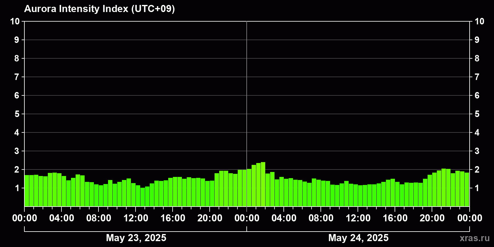 Changes in the auroral intensity index from 2025-05-23 to 2025-05-24 local time