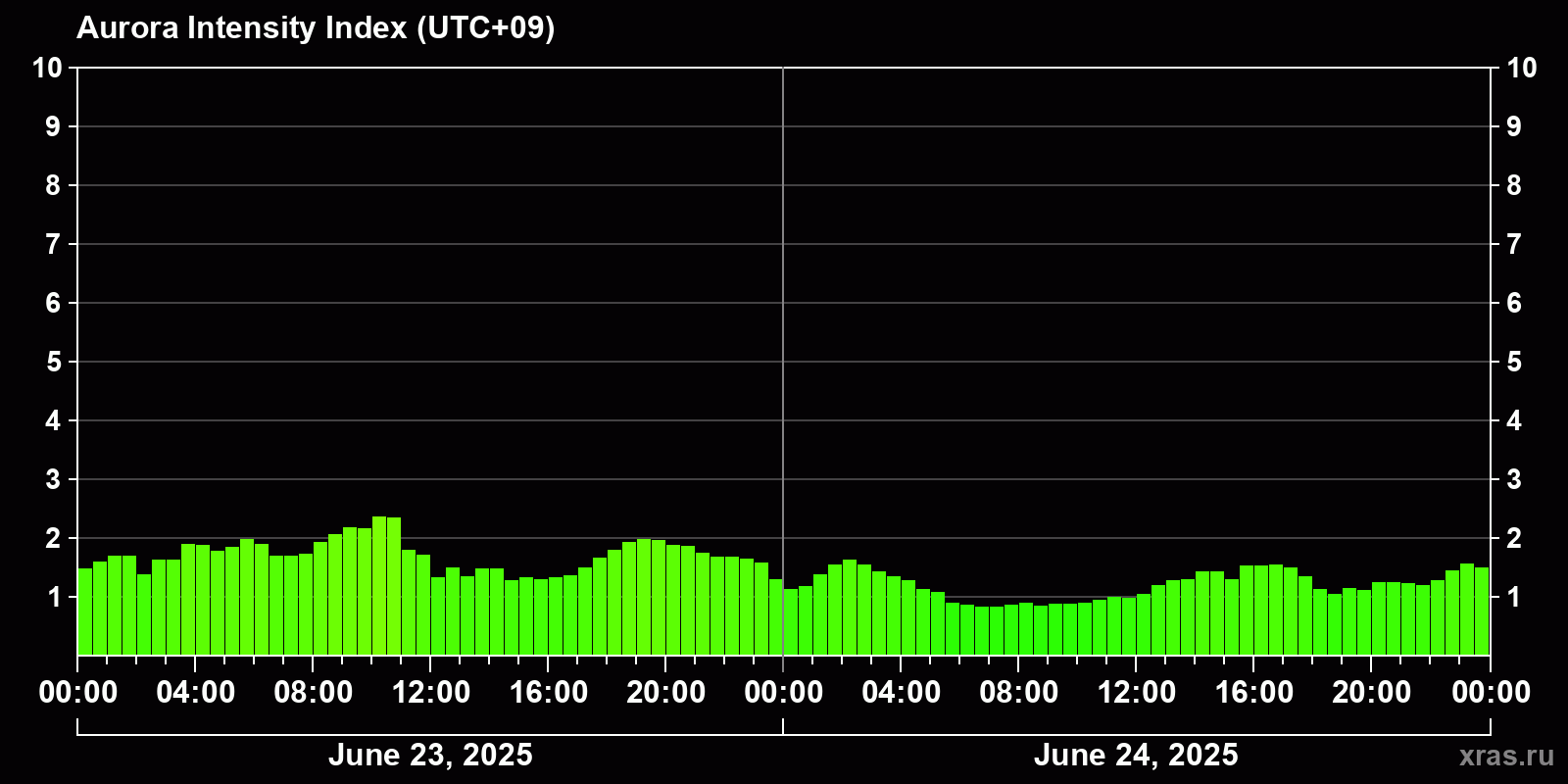 Changes in the auroral intensity index from 2025-06-23 to 2025-06-24 local time