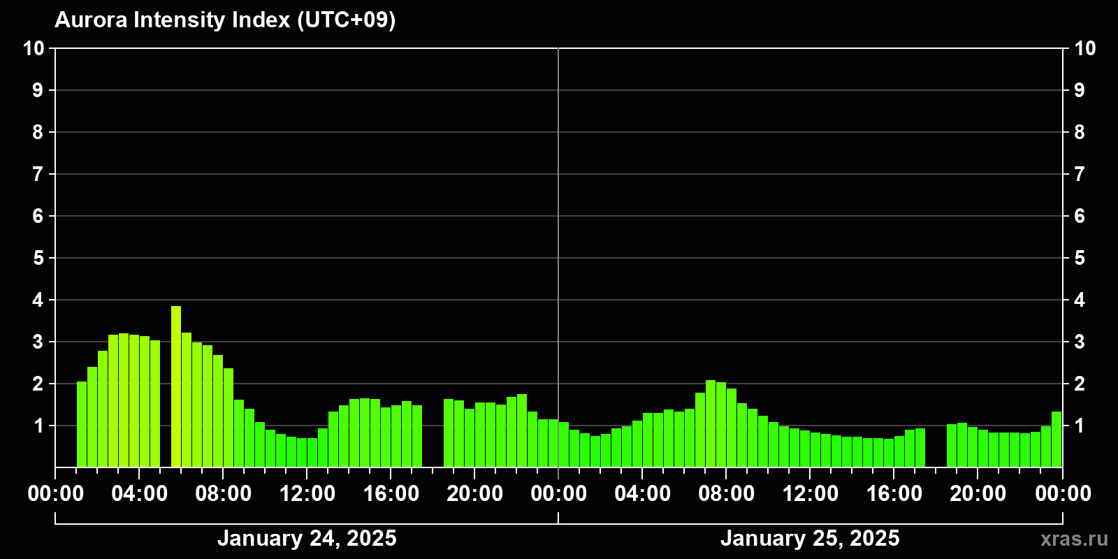 Changes in the auroral intensity index from 2025-01-24 to 2025-01-25 local time