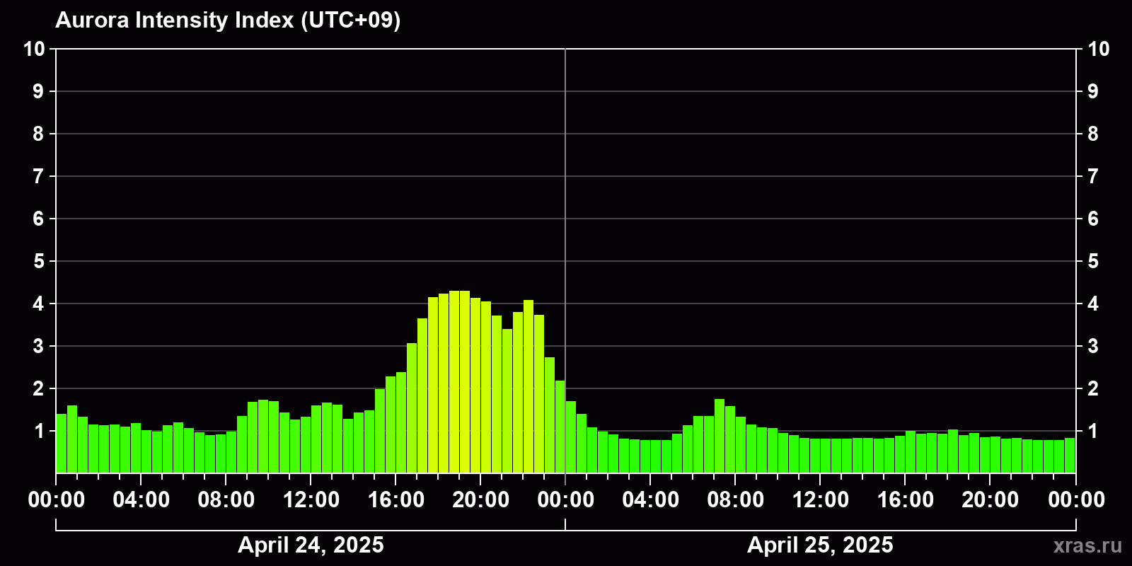 Changes in the auroral intensity index from 2025-04-24 to 2025-04-25 local time