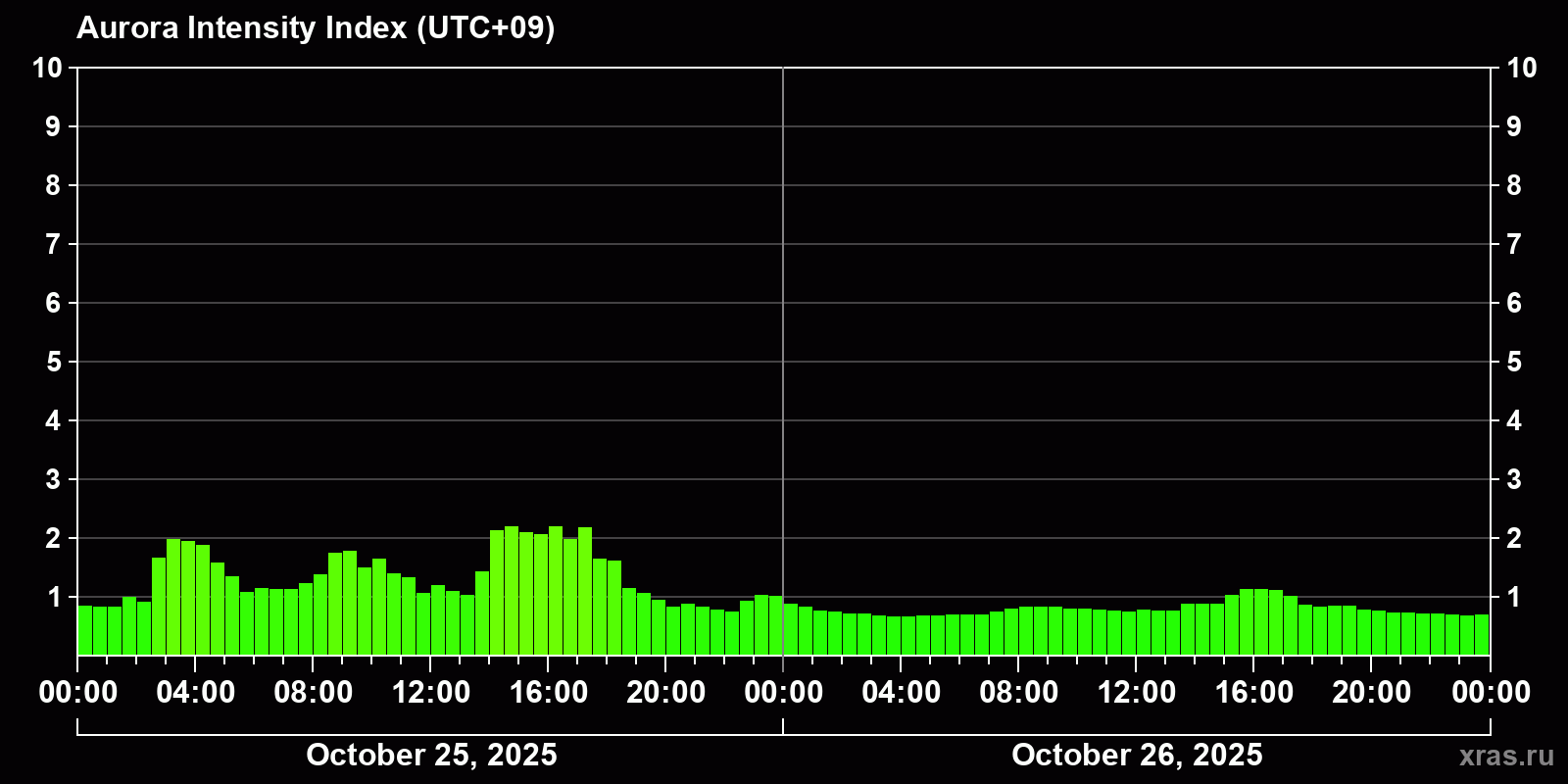 Changes in the auroral intensity index from 2025-10-25 to 2025-10-26 local time