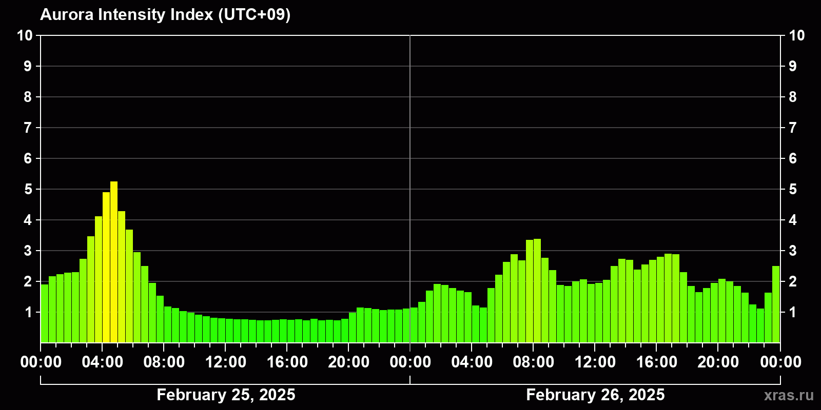 Changes in the auroral intensity index from 2025-02-25 to 2025-02-26 local time