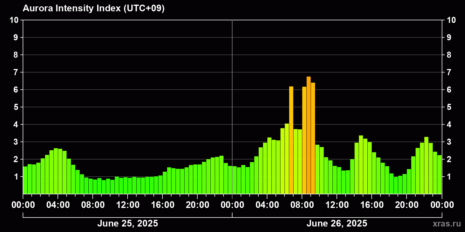 Changes in the auroral intensity index from 2025-06-25 to 2025-06-26 local time