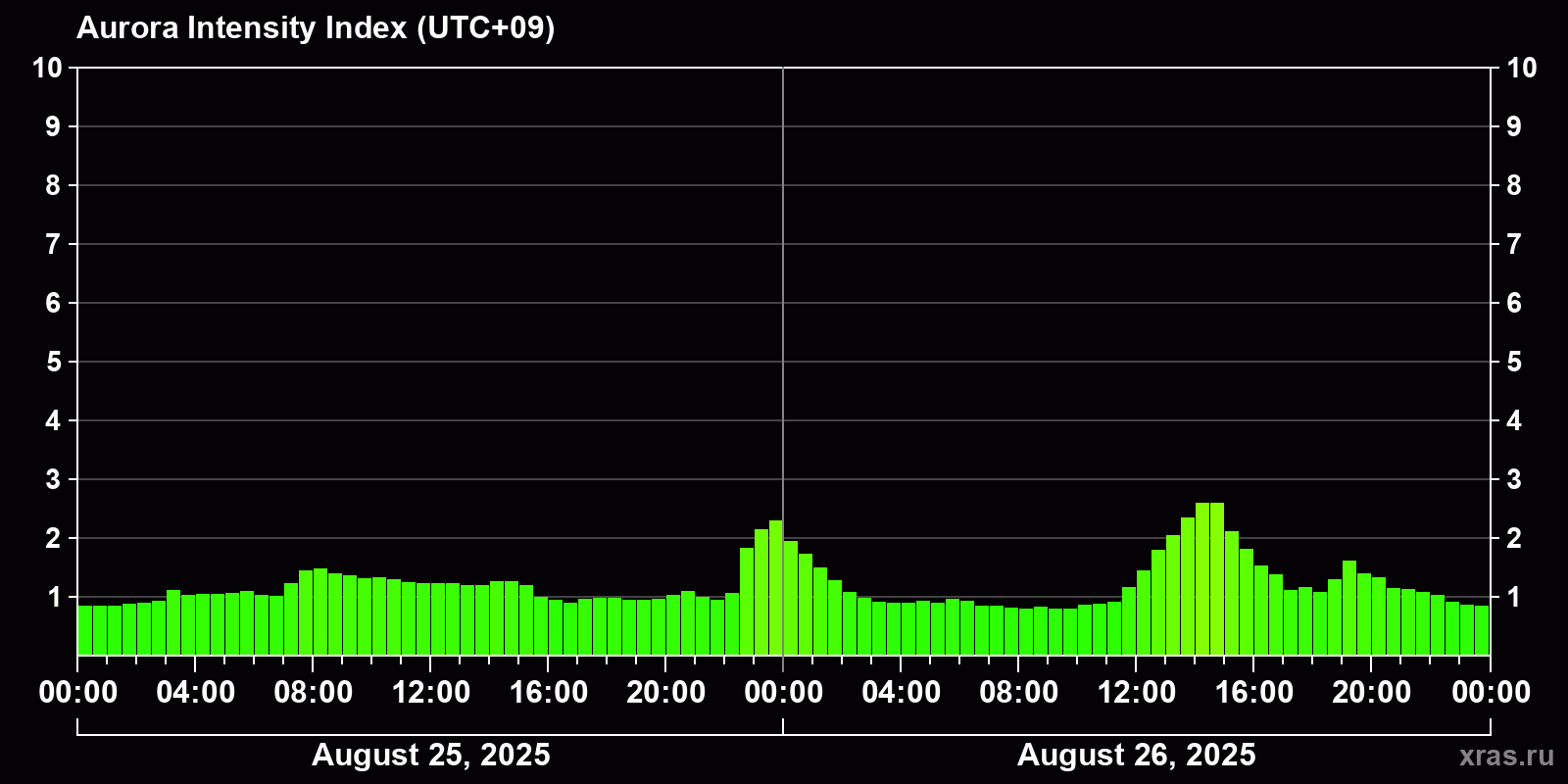 Changes in the auroral intensity index from 2025-08-25 to 2025-08-26 local time