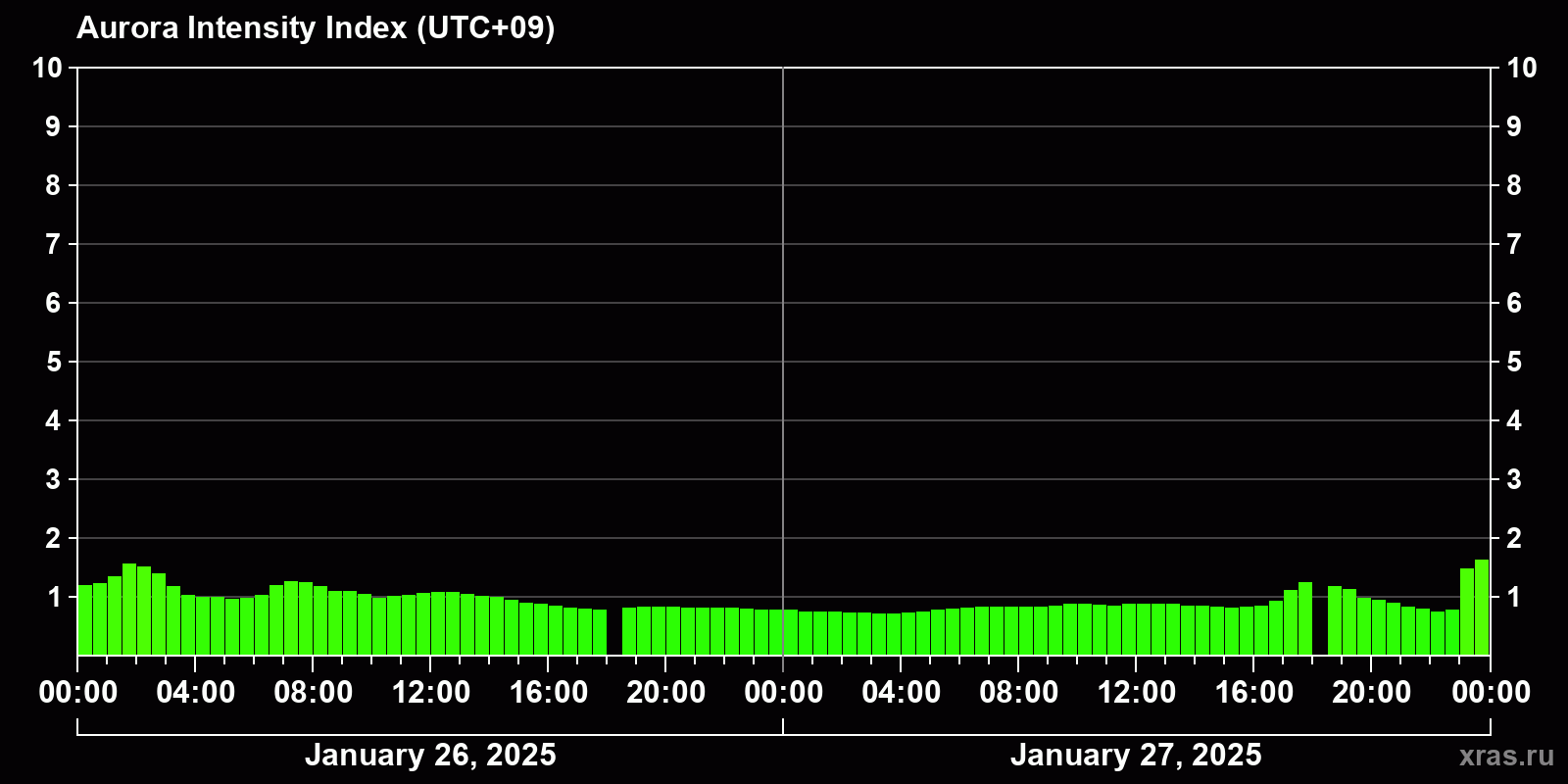 Changes in the auroral intensity index from 2025-01-26 to 2025-01-27 local time