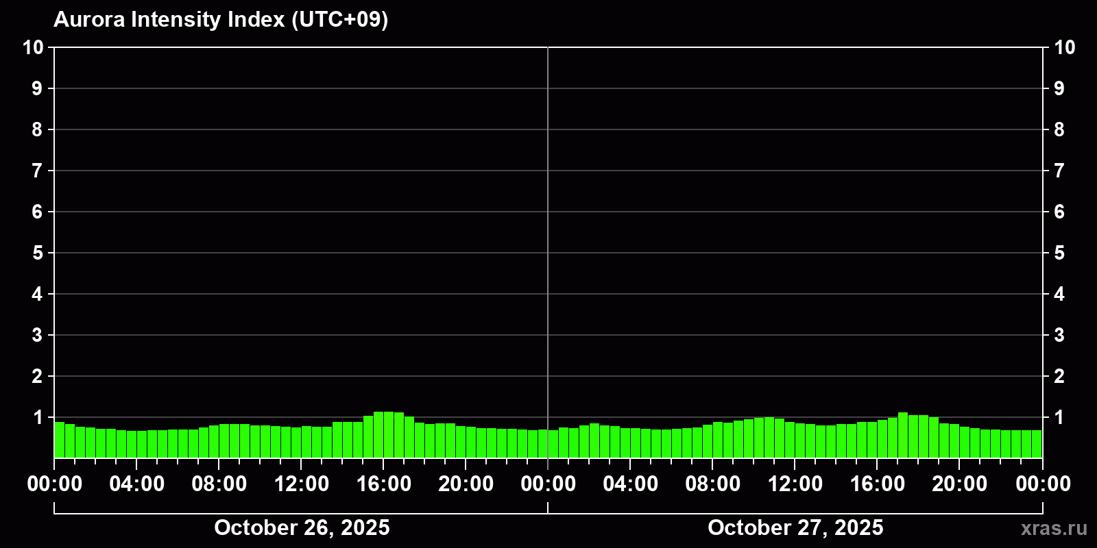 Changes in the auroral intensity index from 2025-10-26 to 2025-10-27 local time