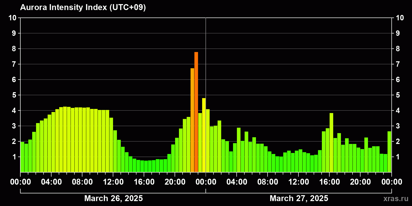 Changes in the auroral intensity index from 2025-03-26 to 2025-03-27 local time