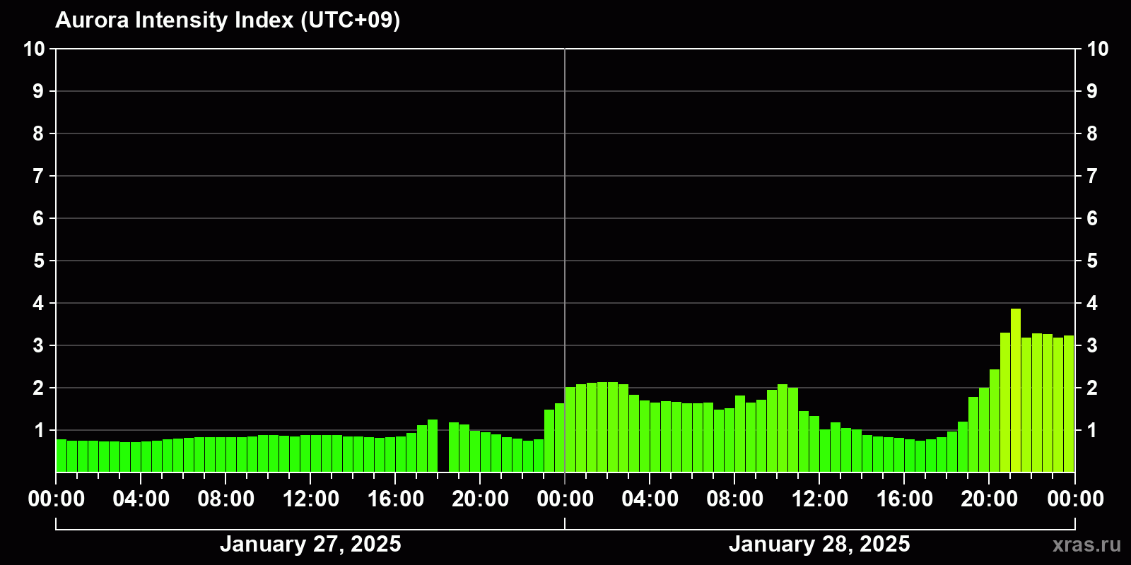 Changes in the auroral intensity index from 2025-01-27 to 2025-01-28 local time
