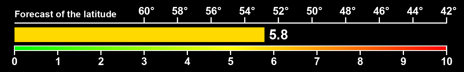 Auroral intensity index and the theoretically possible latitude of observations for nighttime in the Western Hemisphere as of 2026-01-28 23:46 (end of day) local time