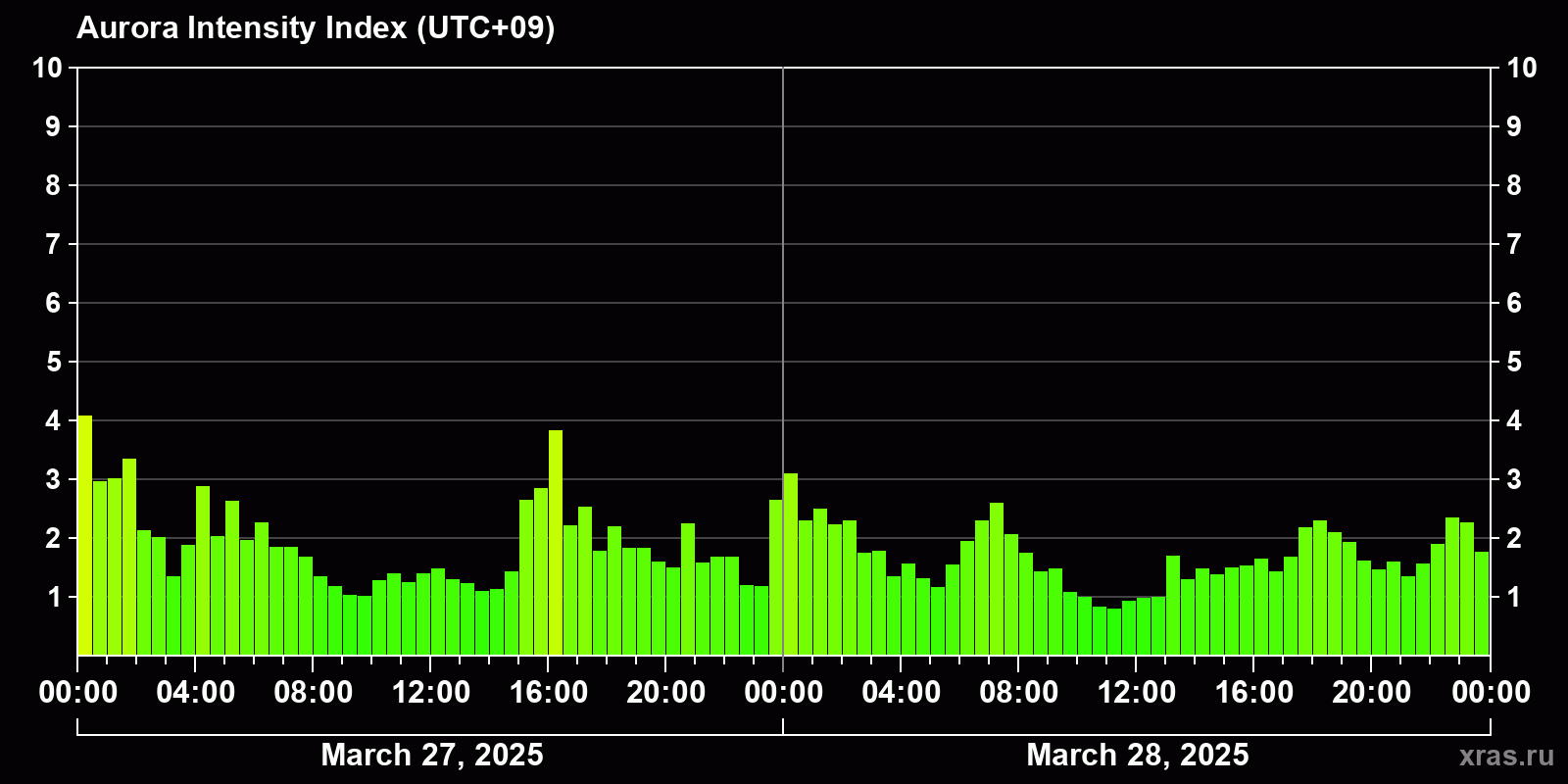 Changes in the auroral intensity index from 2025-03-27 to 2025-03-28 local time