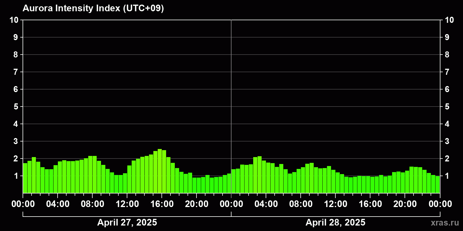 Changes in the auroral intensity index from 2025-04-27 to 2025-04-28 local time
