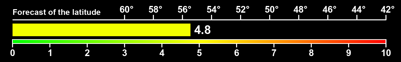 Auroral intensity index and the theoretically possible latitude of observations for nighttime in the Western Hemisphere as of 2026-01-29 23:46 (end of day) local time