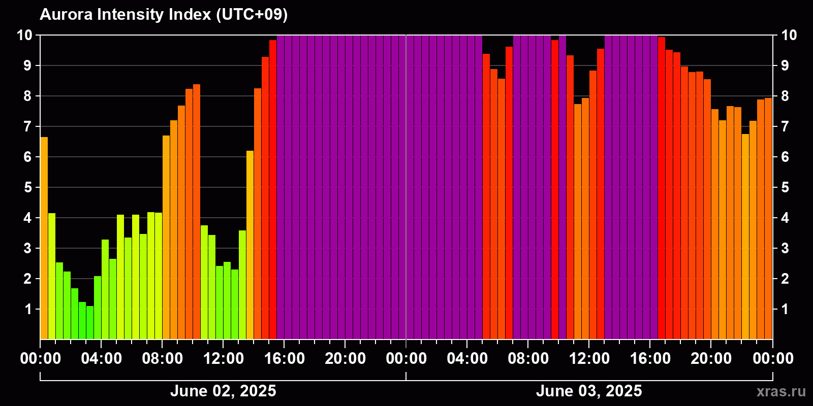Changes in the auroral intensity index from 2025-06-02 to 2025-06-03 local time