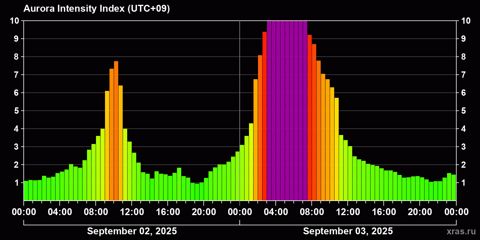 Changes in the auroral intensity index from 2025-09-02 to 2025-09-03 local time
