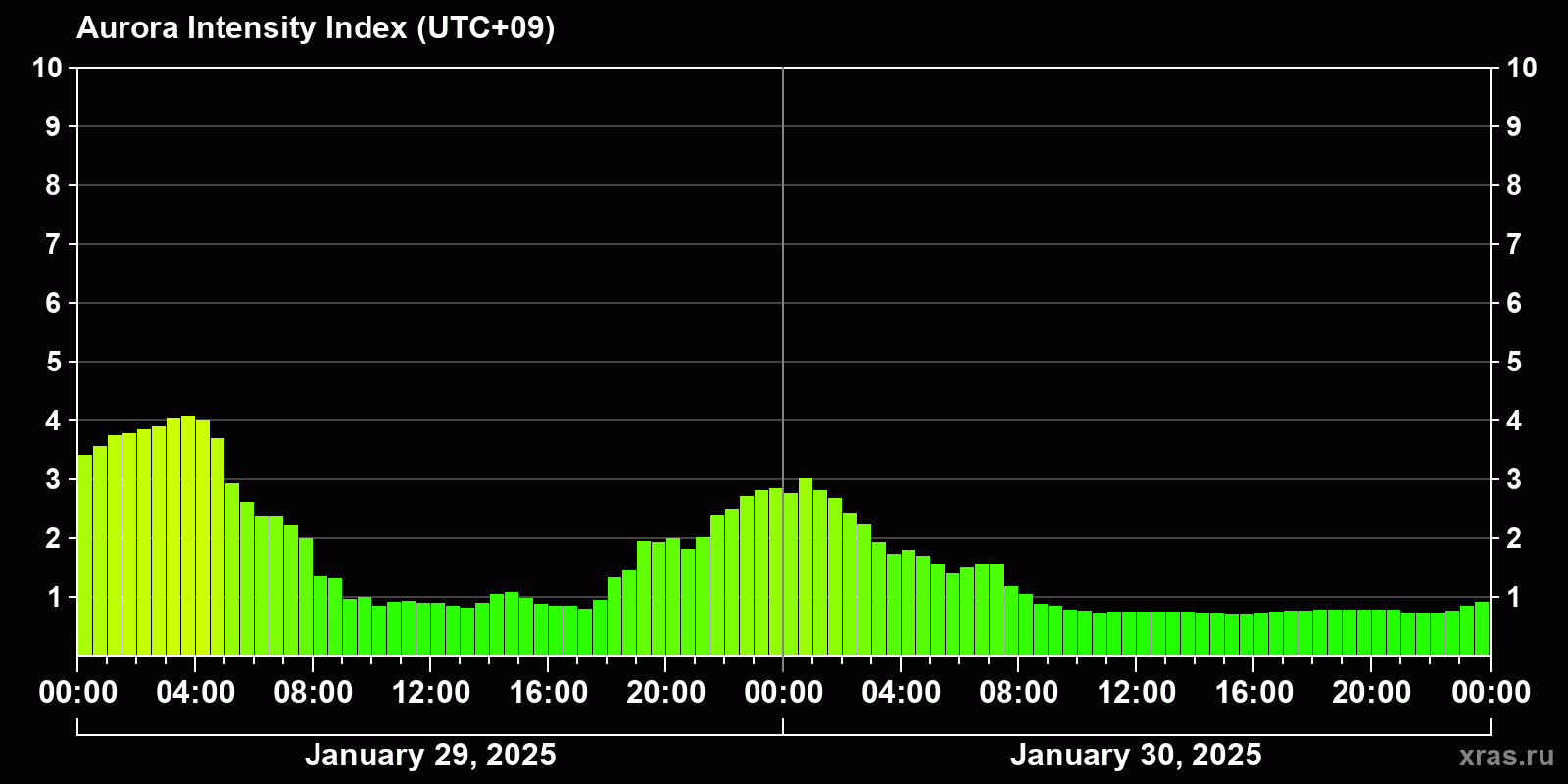 Changes in the auroral intensity index from 2025-01-29 to 2025-01-30 local time