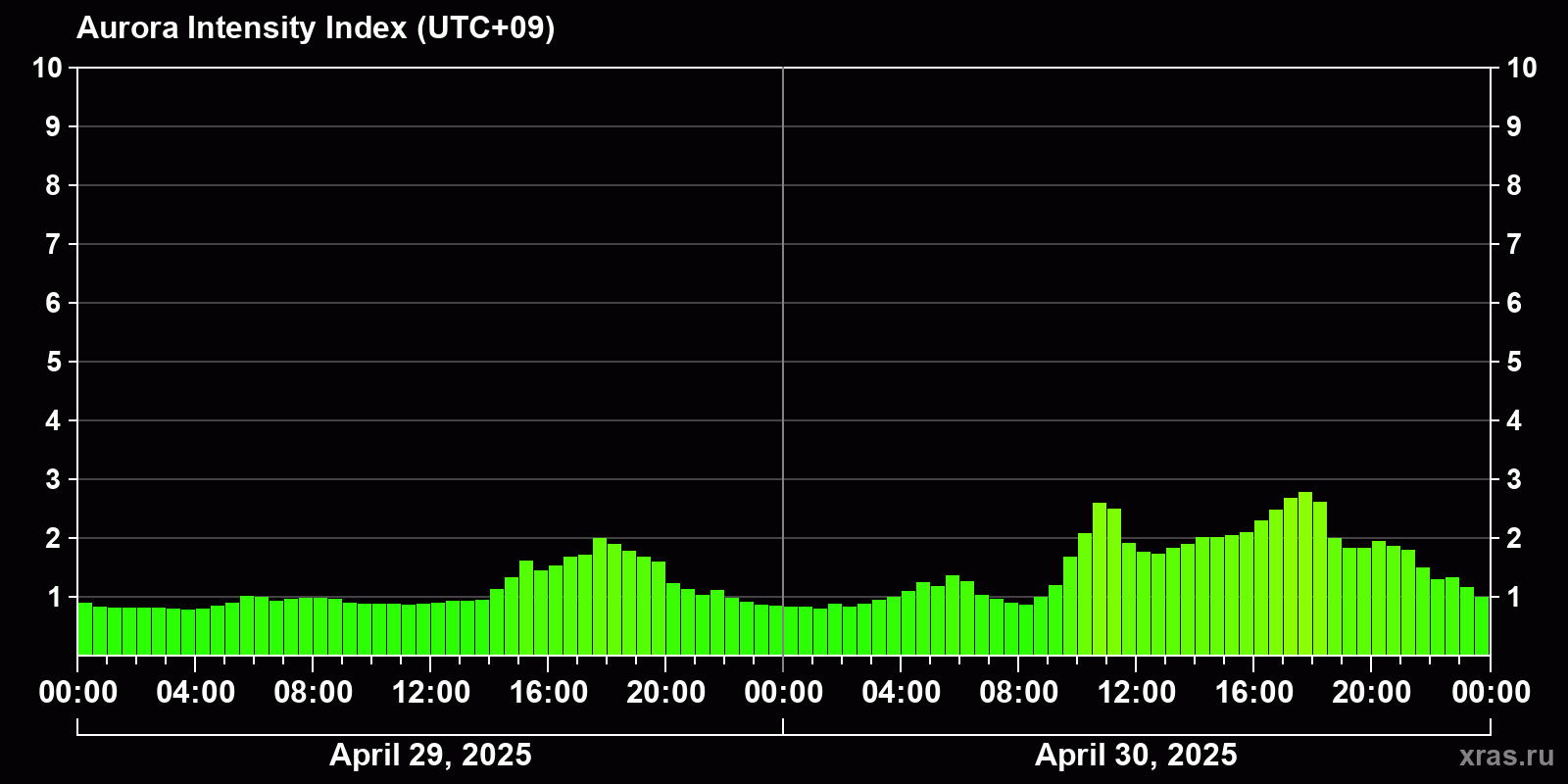 Changes in the auroral intensity index from 2025-04-29 to 2025-04-30 local time