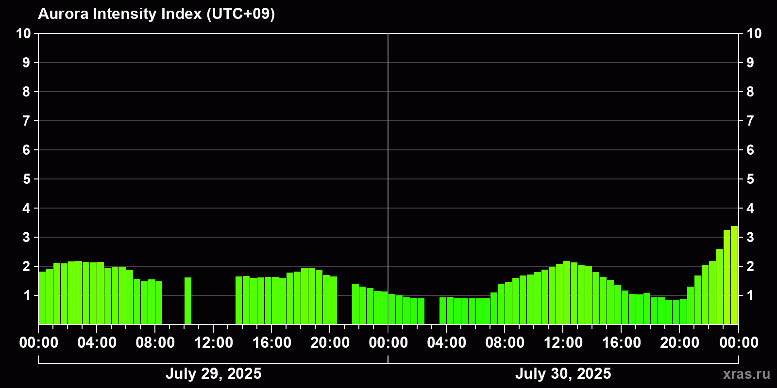 Changes in the auroral intensity index from 2025-07-29 to 2025-07-30 local time
