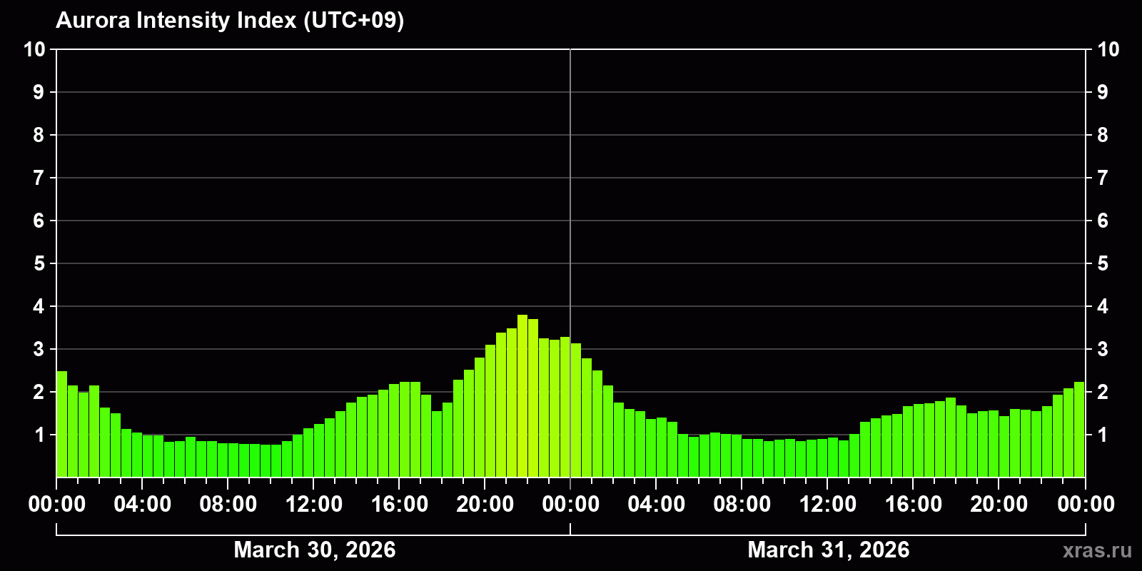 Changes in the auroral intensity index from 2026-03-30 to 2026-03-31 local time