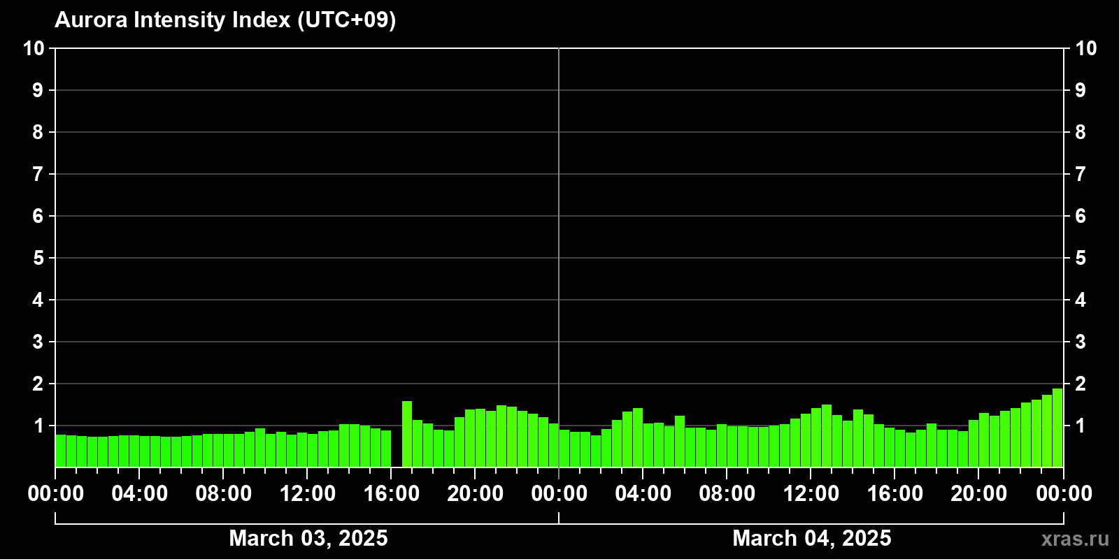 Changes in the auroral intensity index from 2025-03-03 to 2025-03-04 local time