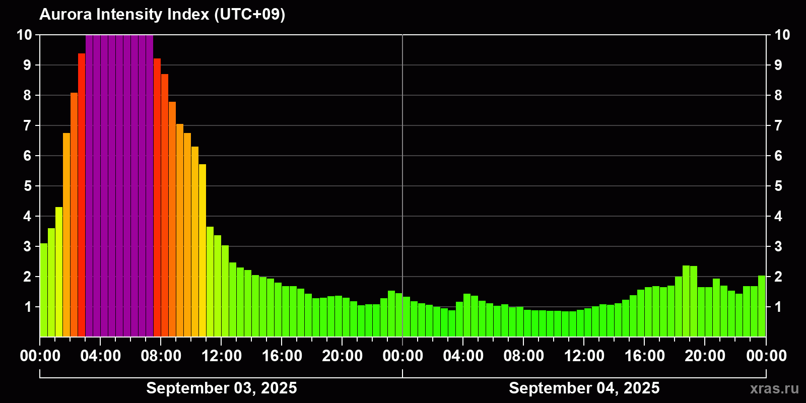 Changes in the auroral intensity index from 2025-09-03 to 2025-09-04 local time