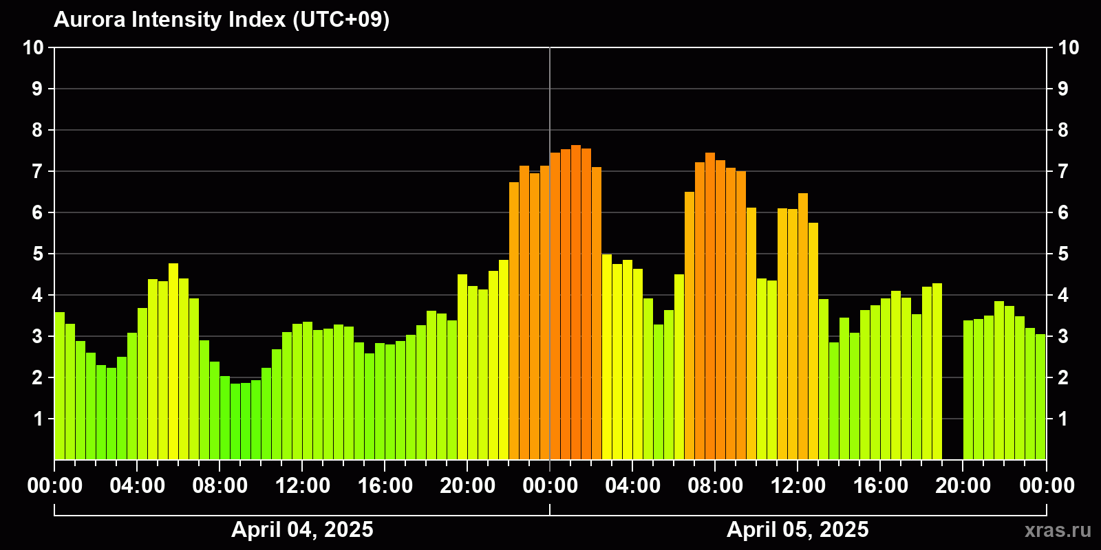 Changes in the auroral intensity index from 2025-04-04 to 2025-04-05 local time