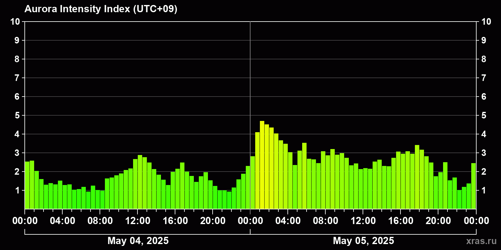 Changes in the auroral intensity index from 2025-05-04 to 2025-05-05 local time