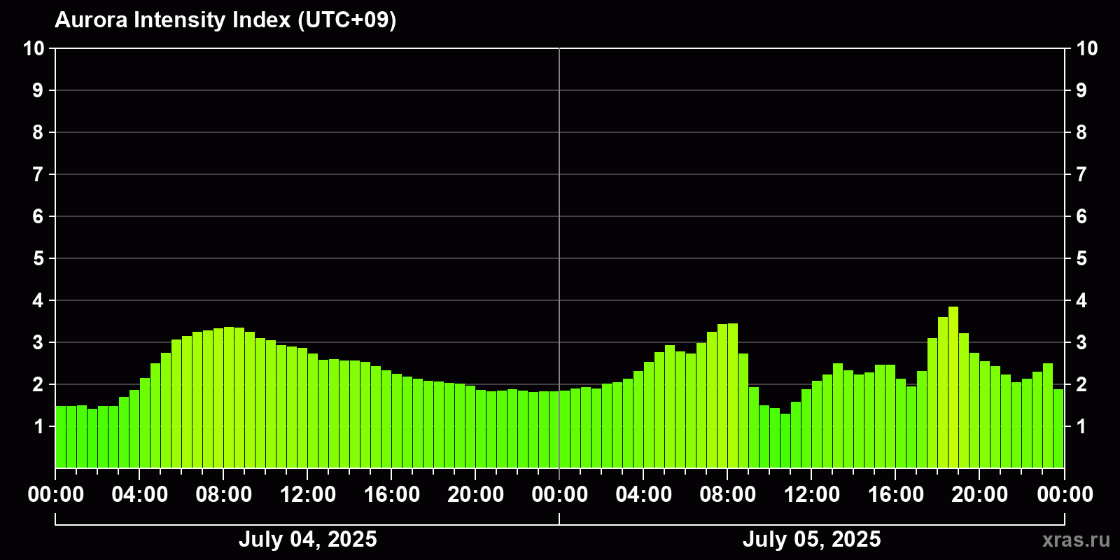 Changes in the auroral intensity index from 2025-07-04 to 2025-07-05 local time