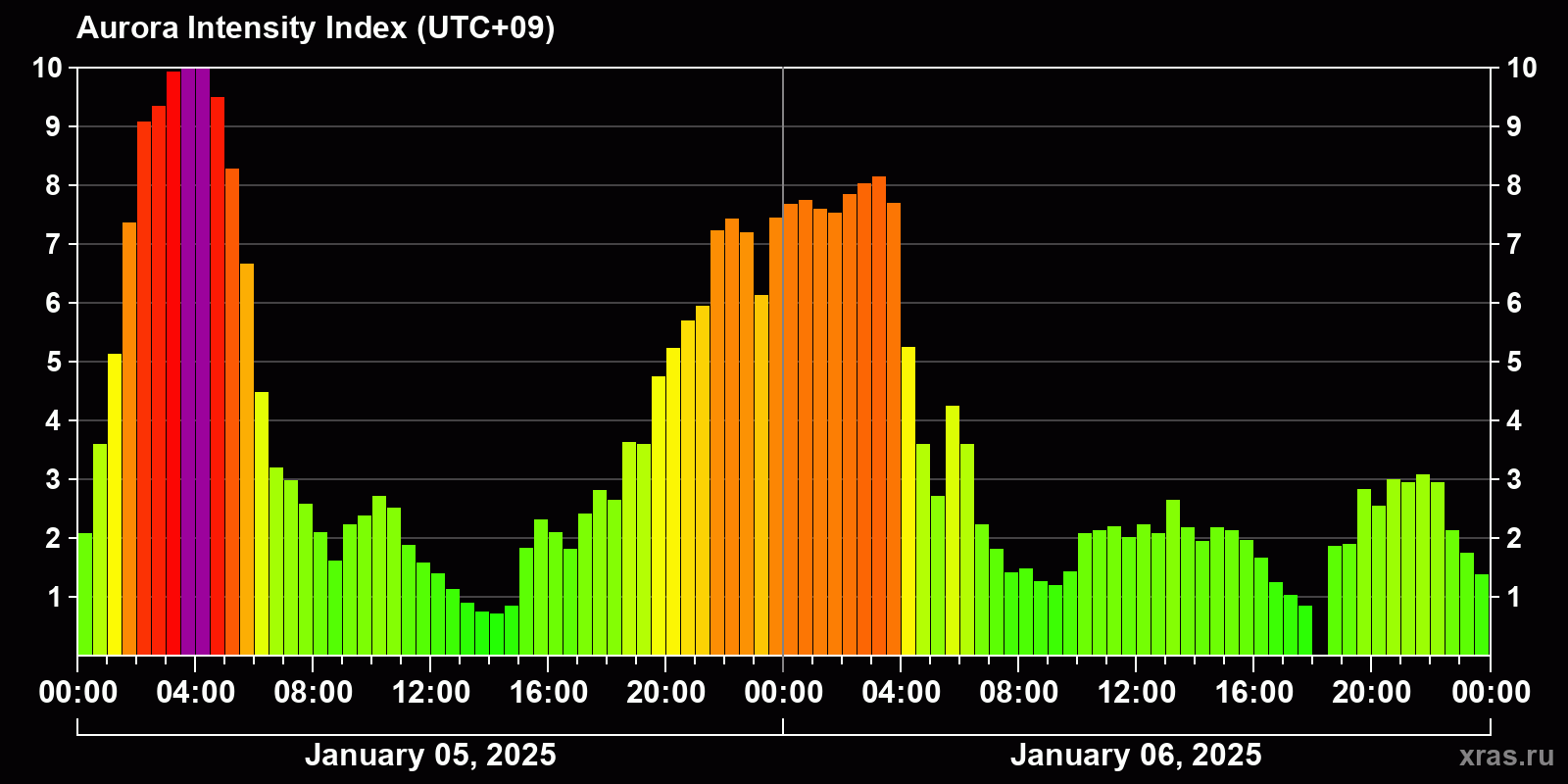 Changes in the auroral intensity index from 2025-01-05 to 2025-01-06 local time