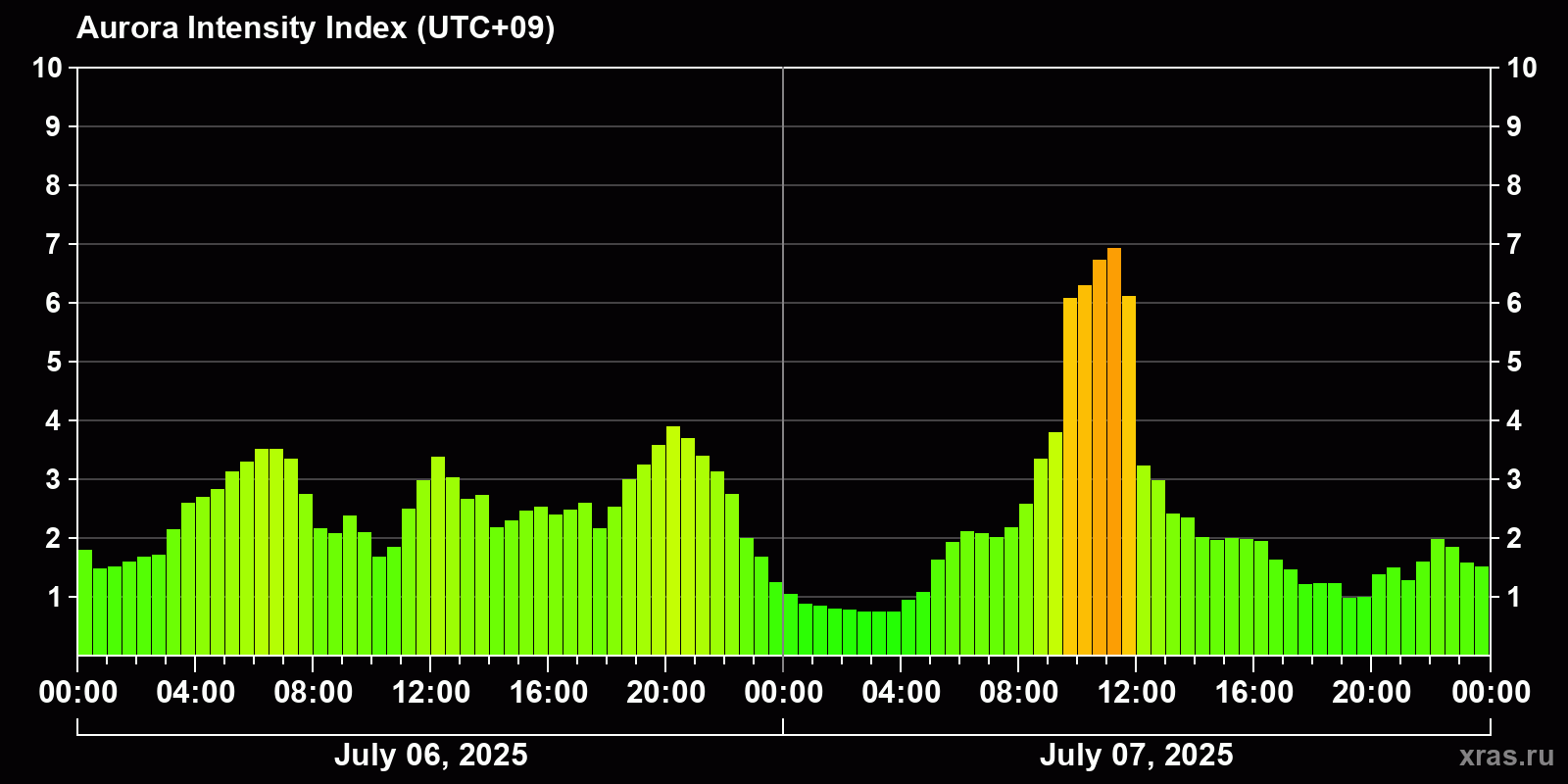 Changes in the auroral intensity index from 2025-07-06 to 2025-07-07 local time