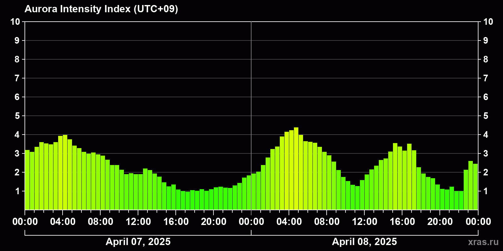 Changes in the auroral intensity index from 2025-04-07 to 2025-04-08 local time