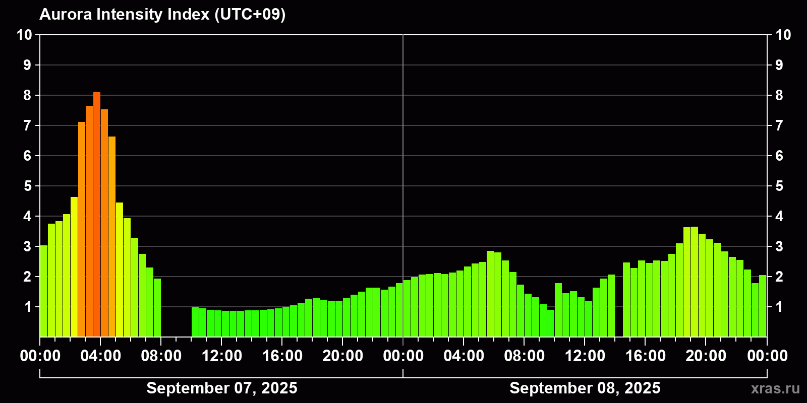 Changes in the auroral intensity index from 2025-09-07 to 2025-09-08 local time