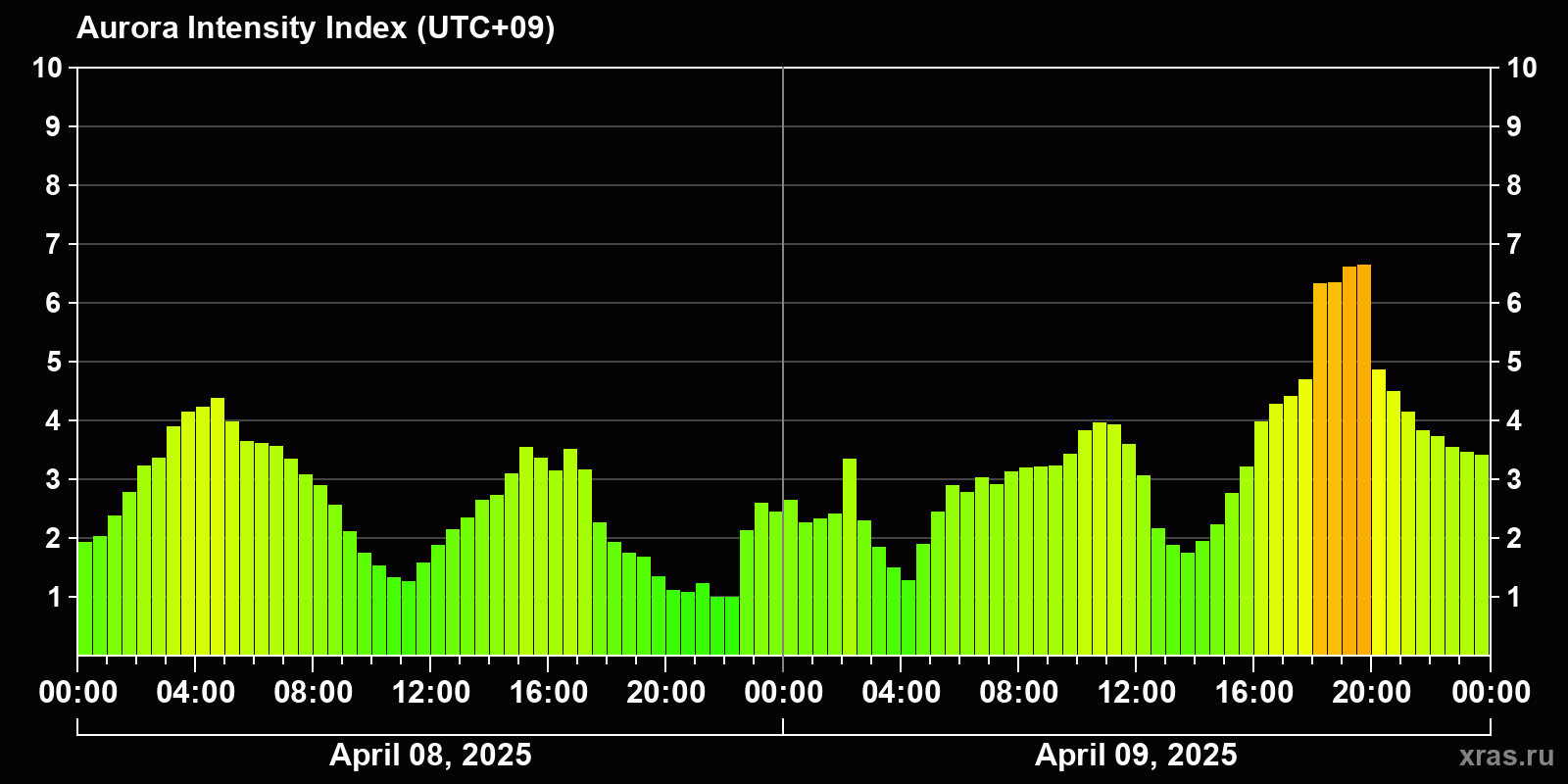 Changes in the auroral intensity index from 2025-04-08 to 2025-04-09 local time