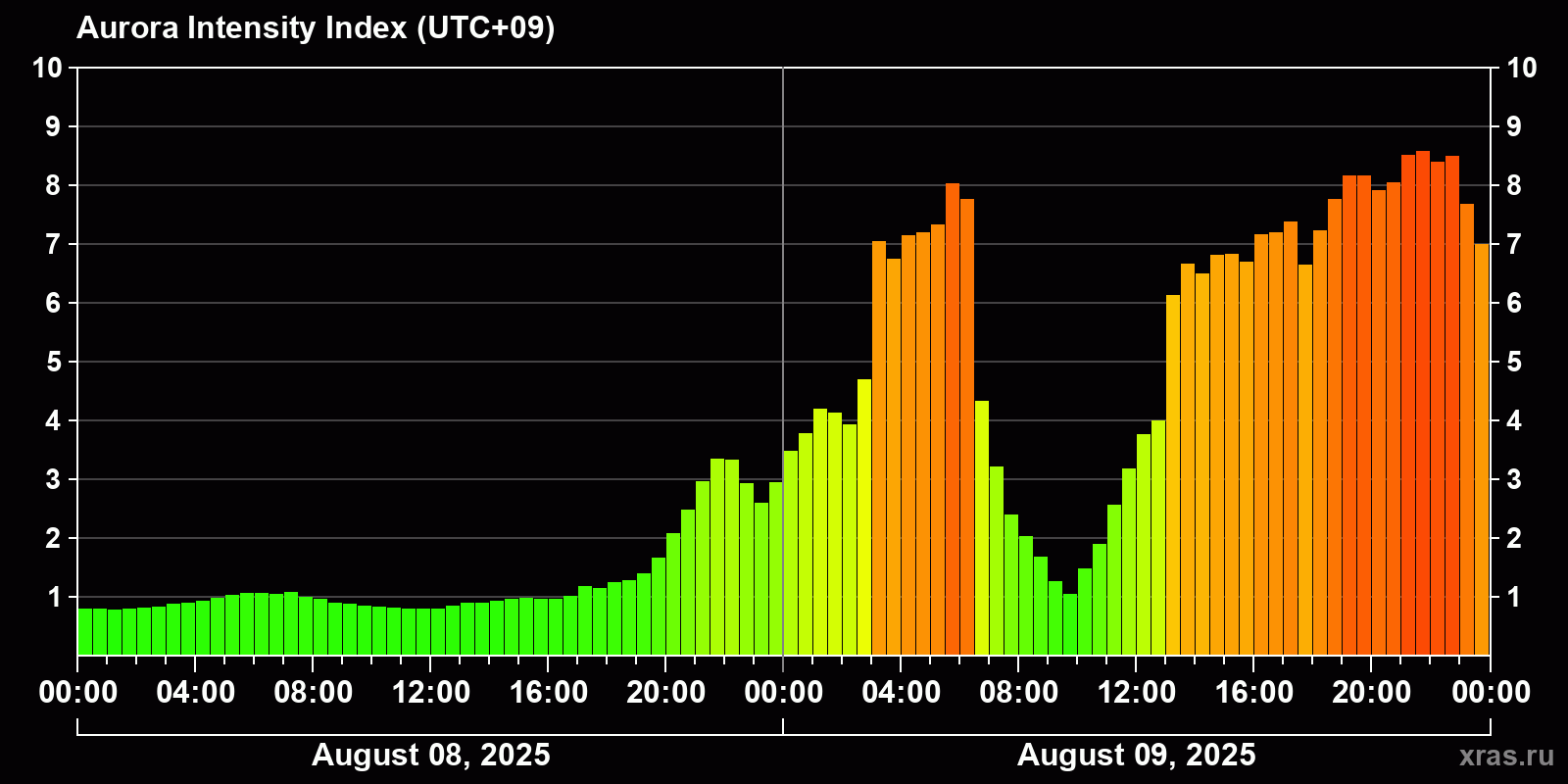 Changes in the auroral intensity index from 2025-08-08 to 2025-08-09 local time
