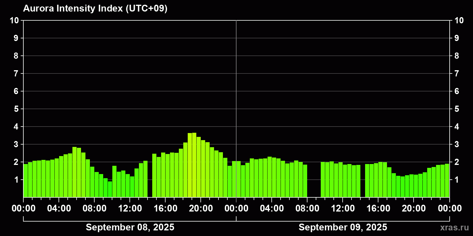 Changes in the auroral intensity index from 2025-09-08 to 2025-09-09 local time
