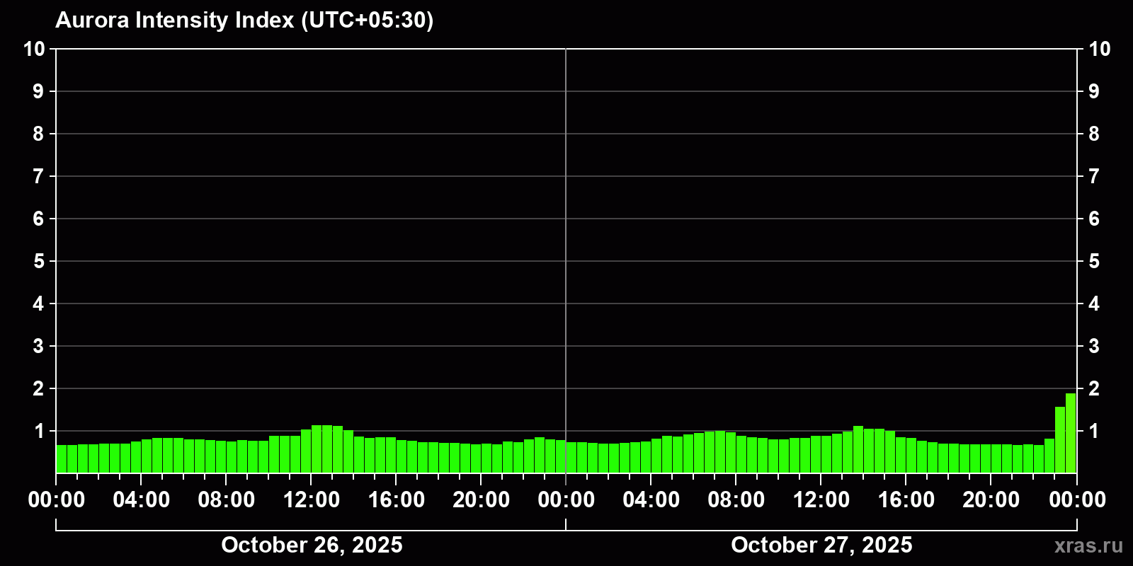 Changes in the auroral intensity index from 2025-10-26 to 2025-10-27 local time