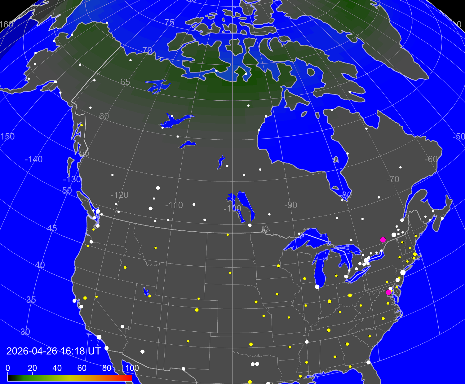 Auroral intensity index and theoretically possible latitude of observations for nighttime in the Western Hemisphere